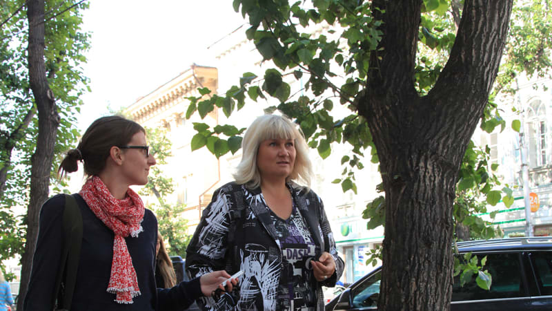 – Однажды мы вдвоём с подружкой забрались на самый конёк «Военной книги», тогда это было одно из наиболее высоких зданий по Урицкого. Счищая слои набелов, наросты штукатурки до кирпича (руки болели ужасно, многие тогда получили даже растяжения кистей, вручную скалывая эти слои), мы обнаружили герб. То ли бронзовый, то ли латунный, дореволюционный! К нам приезжали журналисты, пытались, дрожа, забраться наверх. Первое время, когда поднималась на леса, тоже чувствовала головокружение, но это быстро прошло. Мы бегали по лесам, как белки. Так что, выходит, мы давали интервью на высоте, – вновь улыбается Елена.