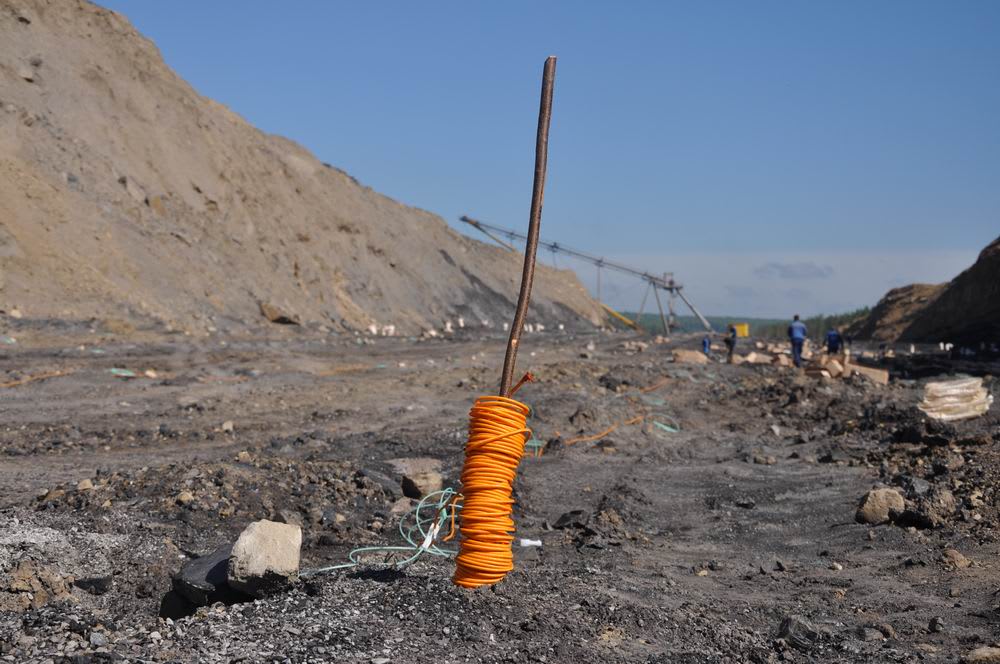 «По плану сейчас взрываем междупластие», – уточняет горный мастер участка взрывных работ Степан Мамон, когда мы прибываем. И объясняет, что это необходимо для рыхления породы, твёрдой настолько, что без предварительной подготовки экскаватор просто не сможет захватить её ковшом. Чтобы раздробить её до нужного состояния, в нашем случае потребовалось 23 тонны взрывчатых веществ. Если точнее, обычной промышленной взрывчатки,  гранулита и эмульсолита. «Всё на основе селитры», – отмечает Балушкин. Горный мастер, который стоит рядом, добавляет, что гранулит использовался, когда заряды закладывались в сухие скважины, если же в них попадалась вода, применяли эмульсолит, отличающийся водостойкостью.
