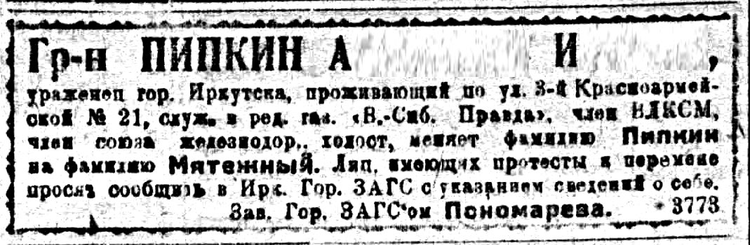 Иркутянин Л. Балдин в детстве, видимо, достаточно настрадался, когда слышал вслед: «Эй ты, Балда, иди сюда!» Когда представилась возможность, он не стал брать банальной фамилии. Он пожелал быть Леонтием Большевиковым. Как гонялись дети за гражданином Г. Веташковым и что они кричали ему, представить нетрудно. Потому после революции он отрёкся от старого мира, отряхнул его пыль со своих ног вместе с «ветхой» фамилией. И стал «Г. Вольным». Не легче было и И. Пипкину, который, судя по приведённым в газете данным, работал в «Восточно-Сибирской правде». Пипкин решил, что должен кардинально поменять судьбу и из Пипкина стал Мятежным. Гражданин А. Негодяев, проживавший в 1935 году в Черемхове, из Негодяева превратился в Ударникова. Ещё один Негодяев, черемховский учитель, в 1921 году объявил в газете, что он, жена и сын не желают быть Негодяевыми, а берут себе фамилию Янковские.