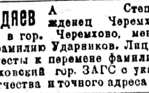 В 1936 году семья Собакиных из Черемхова – оба супруга и дочь – решили стать ни много ни мало Лермонтовыми. А 23-летний красноармеец 35-го Троицко-Саввского артиллерийского полка Илларион Сивков, видимо, увлечённый поэзией, объявлял через газету, что он намерен стать Николаем Кольцовым.