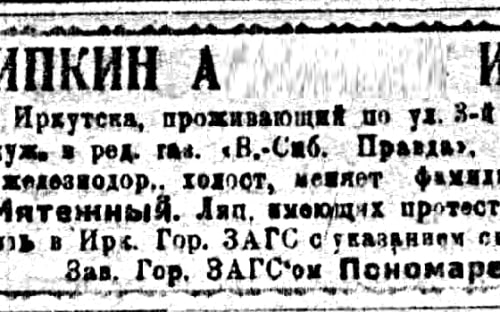Мы не будем приводить полные данные людей, сменивших неблагозвучные фамилии на более приятные уху, поскольку в Иркутске могут до сих пор жить их родственники и не хотелось бы причинить им неудобство. Вот объявление от 1928 года: «Срулёв М.., происходящий из гр. Иркутска и гр. Ви…р-Срулёва… переменяют фамилию «Срулёвы-Ви…р» на фамилию «Мартовы». Среди менявших фамилии иркутян была дама, которая впоследствии возглавила один из диспансеров Иркутска. А фамилию она поменяла ещё будучи студенткой мединститута, едва ей исполнилось 18 лет. Предыдущая её фамилия звучала как Трупп и для будущего врача не совсем подходила.