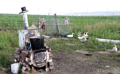 По двору степенной стайкой бродят гуси, беспорядочно носятся заполошные куры, где-то рядом слышится ленивое хрюканье свиней. Между этой живностью снуют многочисленные чумазые и целеустремлённые цыганята. Одна, как сорока, хватает цепкими пальцами с обгрызенными ногтями диктофон и нахально прищуривается: «Дяденька, подари, а?» Женщины гортанными цыганскими возгласами отгоняют их на безопасное расстояние.