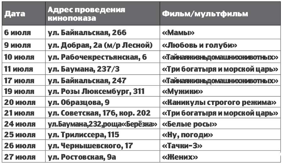 С июня по сентябрь во дворах областного центра будет продемонстрировано более 50 фильмов. Первые кинопоказы уже состоялись в микрорайонах Синюшина гора, Ново-Ленино, Первомайский, предместьях Копай, Марата, на площади Декабристов. Горожане посмотрели полнометражные мультфильмы «Три богатыря и морской царь», «Тайная жизнь домашних животных», фильмы «Легенда № 17», «Стражи Галактики».