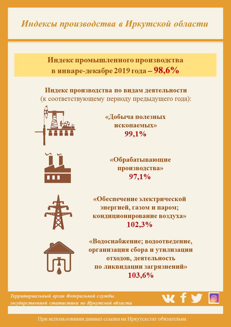 Посмотрим, с каким результатом завершён год в разных сферах деятельности. Объём промышленного производства в Иркутской области в сравнении с предыдущим годом (тогда отмечался рост на 1,2%) снизился на 1,4%. Показатель недалёк от заветной отметки в 100%, и в этом несомненная заслуга малого бизнеса, поскольку без учёта субъектов малого предпринимательства производство снизилось на 2,6%.