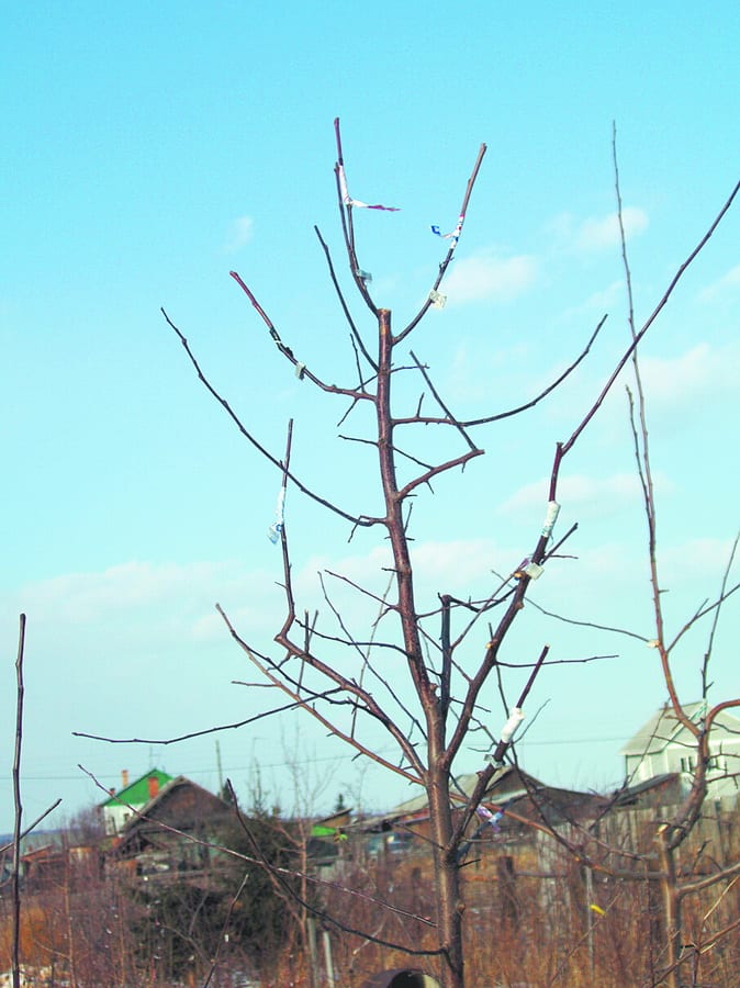 Привои я заготовила с осени и хранила в подвале. За сутки перед использованием нужные черенки с обновлёнными срезами ставила в воду. В этом сезоне можно использовать свежесрезанные побеги только тех сортов, что перезимовали без побурения древесины. В моём саду такими оказались яблони-полукультурки Красная гроздь, Бердское, Красноярский сеянец. Даже у ранеток древесина бурая, хотя почки у них более зимостойкие. А общая зимостойкость дерева складывается из параметров зимостойкости коры, однолетних побегов, древесины, почек. У разных сортов любой культуры эти показатели разные. Так, например, у вишни обыкновенной зимостойкость древесины высокая, а плодовые почки подвержены вымерзанию, поэтому её на зиму надо пригибать. А у вишни войлочной в первую очередь подмерзает древесина, вследствие чего отмирают скелетные ветви. У абрикоса этой зимой в моём саду плодовые почки замёрзли: я ставила в воду срезанные ветви – цветы не распустились. Но деревья-то живы! Расцветут следующей весной.