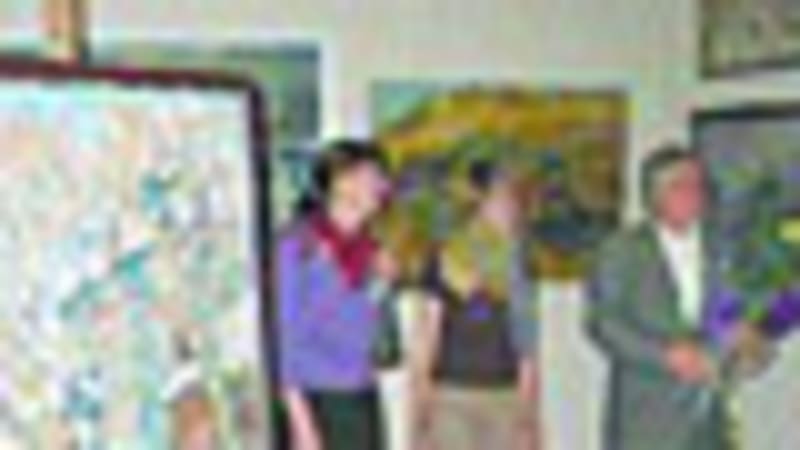 НА СНИМКЕ автора: В. Кузьмин принимает поздравления. На переднем плане — картина, подаренная художником г. Иркутску