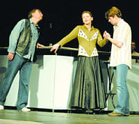 Каждый актёр был наполнен своим персонажем, каждый оправдывал его и любил, даже если персонаж этот был далеко не безгрешен. А Мирандолина, актриса Евгения Гайдукова, торжествовала и внутренне праздновала свою победу над незадачливыми женихами, над их спесью, чванством, надменностью… Я видела, что актёры работали с удовольствием, с блеском в глазах, а музыкальные номера исполняли с особенным удовольствием и азартом. Красивы и изящны танцы Ортензии и Деяниры (актрисы Надежда Савина и Марина Елина). Ярко, острохарактерно выстраивают своих персонажей студенты театрального училища Алексей Орлов, Анатолий Чернов, Василий Конев.