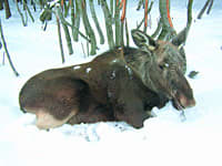 Сколько раз убеждался: дикие животные знают свои угодья не хуже, чем мы свою улицу! Лось вошёл в плотно стоящий пихтовый лес, деревья в котором кое-где обильно обросли листостебельным лишайником. Лишайник рос не только на стволах, но и на ветвях — сыро здесь, хорошо ему в лесу этом. И, переходя от ствола к стволу, лось начал срывать эти лишайники. Дотягиваясь до ветвей, он стал их ломать. На снегу следы разгрома: всё истоптано, рассыпаны мёрзлые обломочки лишайника, наломаны ветви. Не по-хозяйски он тут повёл себя. Надерёшь, наломаешь, затопчешь в снег — до тепла и этих кормов не хватит. Лишайники — еда северных оленей, а тут лось — соперник им нежелательный.
