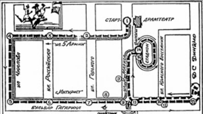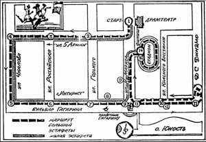 Эстафета проводится по улицам г. Иркутска (схема прилагается). Старт эстафеты 3 мая в 16 часов у драмтеатра, финиш — на стадионе спорткомбината «Труд». Заседание судейской коллегии состоится 2 мая в 17 часов на стадионе «Труд».