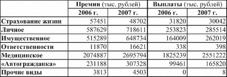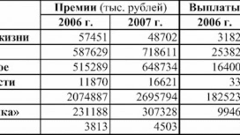 По итогам первого полугодия 2007 года страховщики собрали более 4,4 млрд. рублей взносов. Объём страховых выплат составил около 3,3 млрд. рублей. Существенный разрыв между собранными и выплаченными средствами специалисты объясняют тем, что объём продаж услуг значительно вырос, а страховые случаи, соответствующие проданным полисам, ещё не наступили.