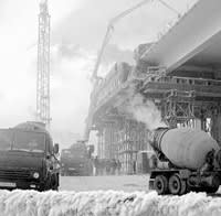 Контуры нового моста более резче обозначились к концу года, когда над пойменной частью Ангары было поднято пролётное строение уже на своём, отечественном комплекте опалубки, захватка которой не 42 метра, как у канадской, а вдвое длиннее – 84 метра. На правобережной эстакадной части бригады МО-125 вели работы с опережением графиков — бетонировали полтора-два пролёта в месяц. Коломенские мостостроители работали сразу по нескольким направлениям. Одни бригады делали стойки опор, другие занимались бетонированием очередного пролётного строения, третьи готовили к спуску на воду плавсистему, плели «кружева» из шпунтового ограждения для русловой опоры… «Оседлавшие» левый берег бригады «Иркутскмостостроя» форсировали сооружение металлоконструкций под временные опоры, готовились к бетонированию пролётов левобережной эстакады.