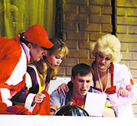 Весь этот «комизм» (который так и просится срифмовать с «комизмом» пошлости) из арсенала «бородатых» штампов броско показателен в сценах «Призрака» с мистером Отисом, американцем, купившим замок Кентервиль на аукционе (и преобразующим его методом «ударно-комсомольской» перестройки в коммерческое заведение «У Призрака»). Фигура, по исполнительству, конечно, русская, но и «новорусской» изюминки, которая так и просится тут, в них нет. Как ни импозантны сами по себе оба исполнителя – В. Варлашов (уж мастер тонкий) и В. Попов, но – не самобытны, не уникальны по хватке характерности персонажа, колориту типа. Ну, много «сытого» крика, «прописной» размашистости, что называется, американца «вообще», виденного уж не раз…