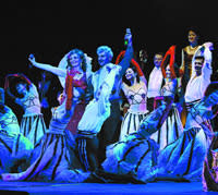 Так и было в этот вечер. Любовь – взаимная. Но и – по-жанровости – не без юмора. Ведь две звезды ИМТ – в труппе многозвёздной. И она – однородная в поклонении бенефициатам – разделилась: солисты и мужская часть хора шарахалась, как табун, из кулисы в кулису с воплями: «Где Она?!» солистки и женская часть хора стайками порхали по сцене, шумно щебеча: «Где Он?!» Все эти метания происходили вокруг кабаре «Орфеум», и направлял их бармен – А. Баязитов, путая номера гримуборных – где Он, а где Она, ибо, продав свою печень (после смерти) академии медицины, уже начал её заспиртовывать. На сцене царило многолюдье, как ни в одном, пожалуй, по звёздности, спектакле. Но из двух возбуждённых толп периодически выпадало по звезде – и начинались сцены, диалоги, певческие, танцевальные дуэты с бенефициантами, и я с публикой дивился: ах, сколько у нас мастеров!