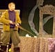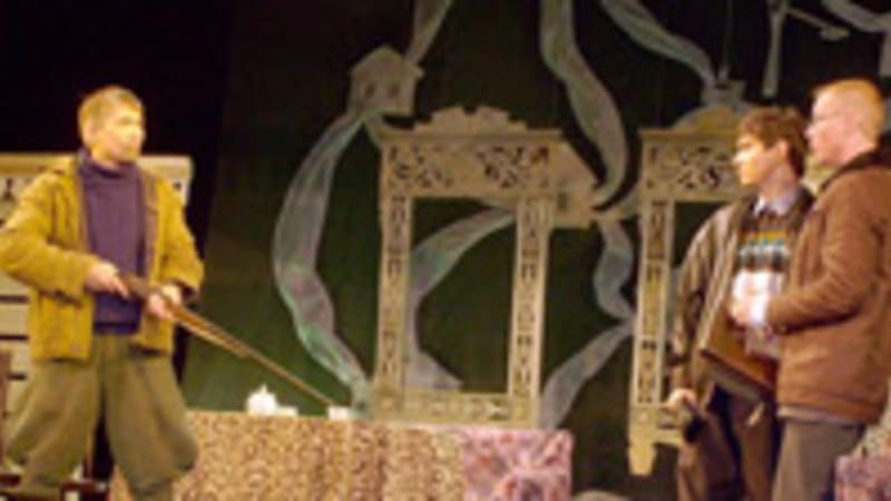 Очень удачно смотрится декорация сцены — украшенные резьбой крыша, простенки, на заднем плане — контуры села, избы и тропинки (работа художника театра Н.Папиной). И музыка — всеми узнаваемая туристская песенка «В турпоходе, бабка…». Первое, что видят зрители в паузах между затемнением сцены, — героев-стариков, Василия (играет Ю.Базилев) и Феню (Н.Скоморовская). Как на портретах: один сидит, другой стоит, со спины, с лица, чтобы запомнились. Актёр Юрий Базилев в труппе недавно, зритель оценил его умение передать характер сельского деда, с больными ногами, в валенках, в тёплой шапке, с батожком. Его жена — статная, в длинных юбках, в платке, скрывающем лоб. Сразу чувствуется её властность и верховенство над дедом. Бедный практикант, возмечтавший написать роман или хотя бы повесть на материале, который найдёт в рассказах старожилов села, оперирует словами и терминами, вовсе неизвестными и непонятными старикам. А несостоявшаяся невестка Елизавета (актриса В.Тальянская) вконец запутывает его, упоминая то захват двух соток в огороде, то пожар по вине деда Василия.