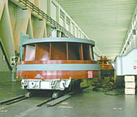 В машинный зал ГЭС спускаемся на специальном лифте. От обычного он отличается только тем, что на стене установлен дисковый телефон и рядом с кнопками, кроме номеров этажей (всего их пять), – отметки положения относительно уровня Тихого океана. Мы опустились на 57 метров и к машинному залу пошли по галерее, в которой отчётливо чувствуется запах погреба. «Рядом овощехранилище для столовой ГЭС. Здесь стабильно низкая температура, всё нормально хранится», – сказал Александр Щеглов.