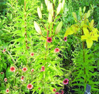 Лапчатка травянистая POTENTILLA. Название произошло от латинского слова potens – «мощь, сила» – по лечебным свойствам некоторых видов. Имеются одно- и многолетние растения. В цветоводстве популярна лапчатка гибридная, которая объединяет сорта и формы, полученные при участии многих видов лапчаток, но в основном от непальской лапчатки и тёмно-кроваво-красной. Это травянистое растение высотой 50-80 см, всё лето усыпанное яркими цветками 2,5 – 5 см в диаметре. Наиболее известны и распространены сорта Мисс Вильмотт – вишнёво-розовые яркие цветки с тёмным глазком, Йеллоу Куин – блестящие жёлтые цветки, Роксана – цветки лососево-оранжевые с тонкими тёмными прожилками и Гибсон Скарлет – блестящие красные цветы, похожие на миниатюрные маки.