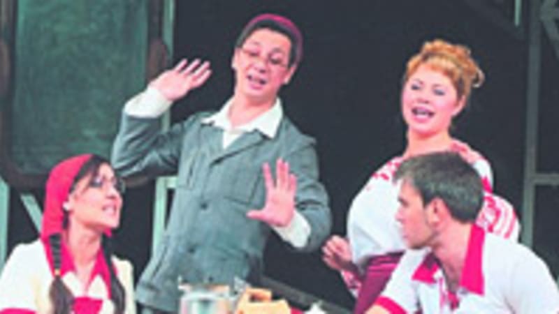 Есть в спектакле и массовые сцены, в которых заняты актёры хора и балета. В начале спектакля они задают тон всему действию, потом приходят непрошеными на свадьбу со своей провизией. Вот только когда танцевать начинают, с продуктами не расстаются, и забавно наблюдать вытанцовывающих парней с тарелками, яйцами и бутылками пива в руках. Кажется, могли бы и на табуретку положить (стол в декорациях не предусмотрен). Но разве могут актёры поменять мизансцену без разрешения режиссёра или балетмейстера, лауреата международного и всероссийского конкурсов Людмилы Цветковой?