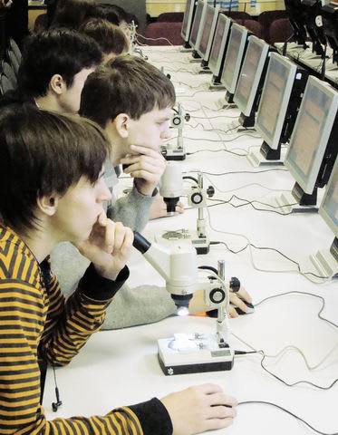 Наличие цифровых микроскопов позволяет учителю при чтении лекции раздать, к примеру, 20 совершенно разных или идентичных, реальных или виртуальных препаратов, а потом наиболее интересные результаты, полученные кем-либо из учеников, вывести на общий экран для коллективного обсуждения. Используя специальные программы, обучающиеся могут самостоятельно или вместе с учителем произвести измерения любых природных объектов как под микроскопом, так и на картах. Программе безразлично, какой объект вы оконтуриваете: живой микроорганизм, рыбью чешуйку или ландшафт. Главное, что любой полученный результат может быть доступен для общего обсуждения. Более того, Интернет, оптико-волоконная и спутниковая связь позволят классу общаться с кем-то из светил российской науки, находящимся хоть в тысячах километров от Листвянки, отправить ему результаты и получить комментарий в режиме реального времени.