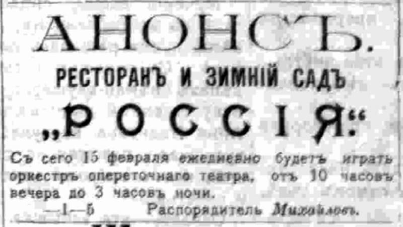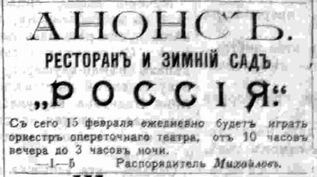 С 15 февраля гостиница «Россия» на Амурской*** распахнула двери зимнего сада, где оркестр услаждал благодарную публику аж до трёх часов ночи. Иркутск давно уже спал, но уполномоченным Императорского Красного Креста, ещё жившим по петербургскому времени, хотелось скрасить дорожный неуют. К их услугам были живые раки и падефруа, а также изысканные образцы ювелирного искусства, явно способствующие пищеварению. Злые языки утверждали, что владельцы гостиниц вкладываются зря, что война неизбежно упростит всё и обеднит, но время доказало обратное. К титулованным проживающим скоро присоединились иностранные и российские корреспонденты, едущие на фронт, офицеры, и прежде не экономившие на гостиницах, а теперь и вовсе пошедшие в распыл. Было много постояльцев и из инженеров. И вся эта «публика с запросом-с» немало способствовала развитию гостиничного сервиса; именно в пору русско-японской войны он и достиг в Иркутске своего расцвета.