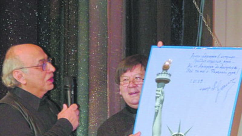 …Вечер получился грандиозный, как и обещала программка: к собственно театральной части добавились, как водится, поздравления и подарки (и мы привезли подарок от иркутских коллег юбиляра, из театра Александра Гречмана: на большом плакате факел статуи Свободы вложен в руку… Кононова).