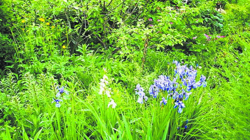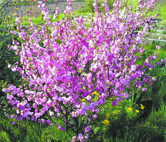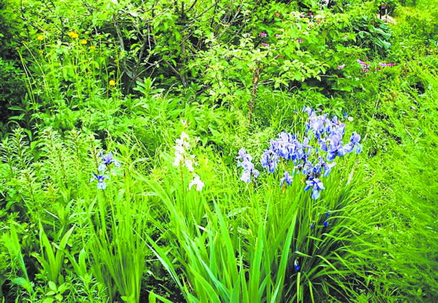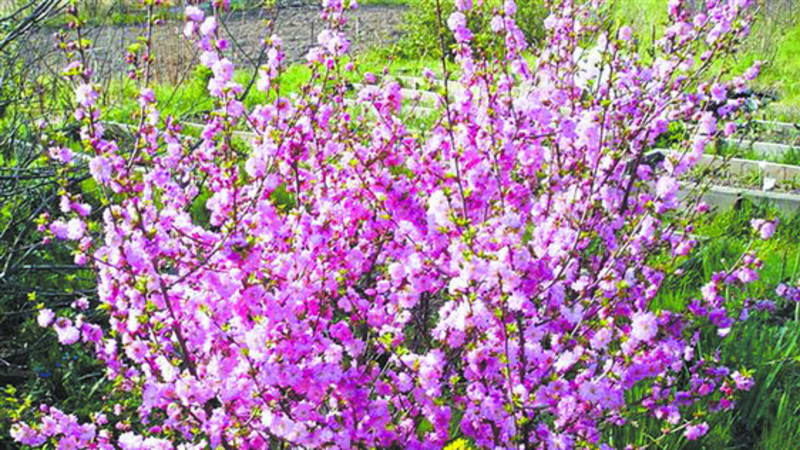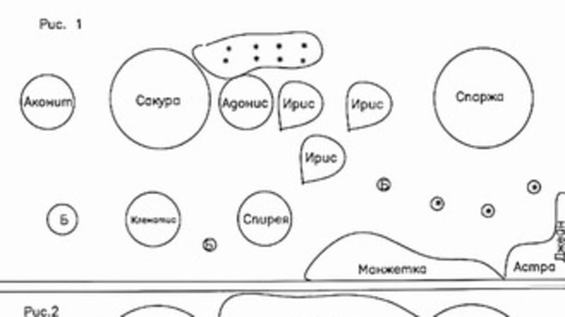 Цветник на солнце (рис. 1). В начале мая зацветают первоцветы, адонис; в конце мая – начале июня – сакура, адонис, манжетка; в конце июня – даурские лилии, ирис сибирский, ну и перед спаржей лилии-саранки, которые выросли сами по себе после освоения участка и растут без пересадки уже 15 лет: сиреневые кудри в ажурной зелени спаржи выглядят очень симпатично. Июль-август: акониты, клематис прямой Морская пена обвивает опору и частично сакуру – облако медовых белых цветов. Август-сентябрь: астра Джейн – яркое малиновое пятно высотой 30 см. И с весны до осени хороша спаржа (аспарагус, ёлочка), которая вырастает до 2 метров в высоту и сохраняет декоративность до глубокой осени (достойная замена дорогой и плохо зимующей в нашем регионе туе). Спирея Литл Принцесс – аккуратный кустик высотой не более 30 см с жёлто-зелёной мелкой листвой – цветёт в июле-августе щитками мелких розовых цветочков. Заключительный аккорд в конце сентября-октябре – цветение безвременника великолепного: выскакивающие из земли и не боящиеся заморозков букеты громадных розовых «крокусов».