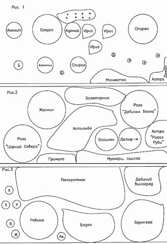 Цветник в полутени (рис. 2). Этот цветник находится перед домом с северной стороны и освещается солнцем рано утром и после обеда. Здесь календарь цветения таков: