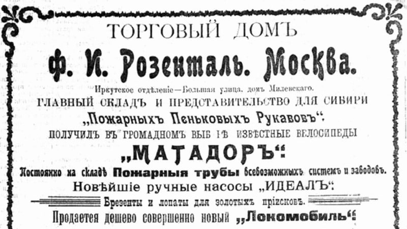 В доме Милевского на Большой иркутское представительство московского торгового дома Розенталя предлагало велосипеды известной торговой марки «Матадор». Они красовались на фоне пожарных рукавов и пожарных же труб различных систем и заводов, брезентов и лопат для золотых приисков. Но всего более Тормасова интересовал сверкающий локомобиль известной английской фирмы, абсолютно новый, но продаваемый очень дёшево, как утверждали торговцы. Глядя на этого красавца, Тормасов так увлёкся, что и про барышню Ельскую как бы забыл. Да и сама Ольга Юрьевна замечталась, вспоминая, как на последних гонках на циклодроме господин Яковлев появился на автомобиле, предлагая всем прокатиться. Отчего-то именно Оленька Ельская оказалась всех ближе и проехалась самой первой, а потом ещё и ещё, в то время как все другие менялись. В разгар катания появился фотограф Ткаченко, и барышня Ельская оказалась на всех его снимках с прелестным, но немного озадаченным лицом.
