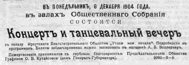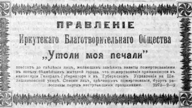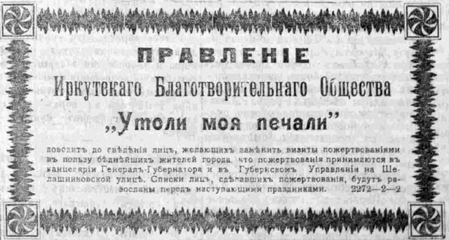 Когда газеты сообщали, что «от Его сиятельства поступило Её сиятельству 100 руб. на нужды благотворительности», такое публичное перекладывание денег из одного супружеского кармана в другой казалось по меньшей мере забавным. Но после этих сообщений иркутские коммерсанты спешили повторить губернаторский жест и при первой же встрече вручали генерал-губернаторше крупные суммы. А в них была большая нужда: графиня Ольга Васильевна взяла под свою опеку и местное общество покровительства животным, и общество защиты детей от жестокого обращения.