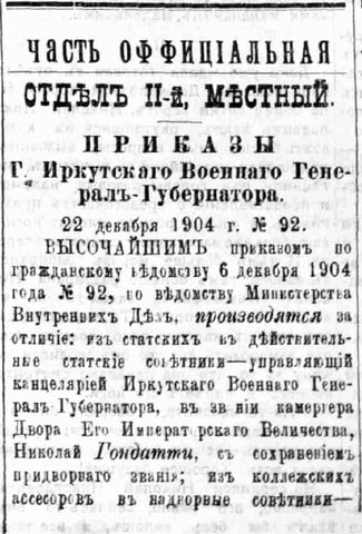 Всякий раз, когда граф возвращается из Петербурга, на вокзал высыпает и военное, и гражданское чиновничество, и местное самоуправление – несмотря на протесты и прямые запреты встречать. За неделю до юбилея Иркутская городская дума провела закрытое совещание и изъявила желание дать обед в его честь. Граф решительно отказался и вообще заявил, что в военное время любая пышность неуместна. Но рано утром 17 июня город всё-таки расцветился флагами, а с 11 часов начался торжественный съезд в генерал-губернаторский дом всевозможных делегатов и представителей. К 12 часам большой зал наполнился до отказа и графиня распорядилась отвести для гостей ещё одну комнату, а ближе к часу и третью. Ровно в час появился Его сиятельство и началось зачитывание приветственных телеграмм из Варшавы, Москвы, Петербурга. В одной из них было, кстати, и сообщение о высочайше пожалованном юбиляру ордене Александра Невского.