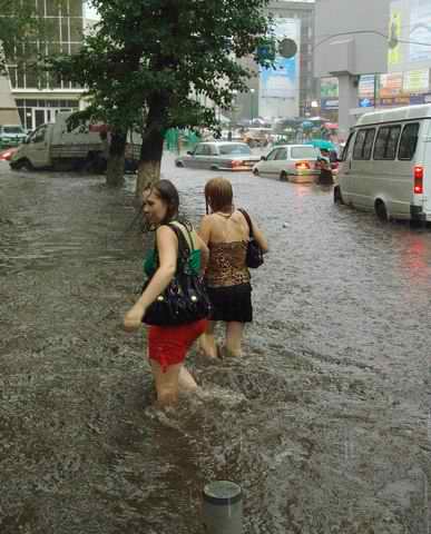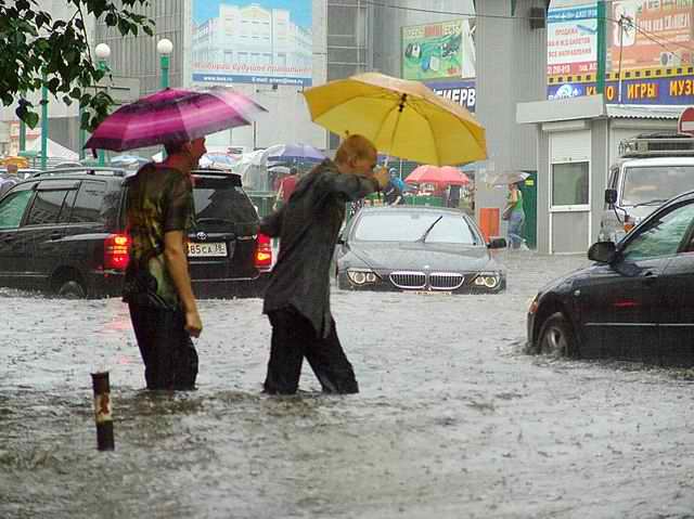 Через час картина не изменилась. Водители застрявших автомобилей совместными усилиями организовывали эвакуацию своих машин из плена стихии. «Экипаж» одной из машин, вооружившись пластмассовыми тазиками, философски вычерпывал воду из своего авто. На месте локального катаклизма по-прежнему не было видно ни работников ГИБДД, ни работников коммунальных служб.
