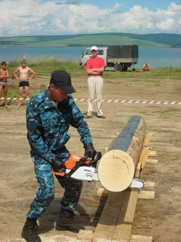 На отдельной площадке соревнуются мастера бензопилы. Судья Леонид Лукинчук строго следит за процессом распиловки. Как на настоящем матче, болельщики поддерживают своих и дразнят соперников: «Усть-Кут – позорище, Балаганск – лучший», – скандирует дружная группа. Судья тщательно осматривает отпиленную «шайбу», оперируя своим профессиональным сленгом: «пропилы», «толщина диска».