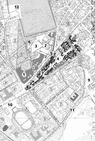 1 – Крестовоздвиженская церковь; 2 – музыкальный театр; 3 – площадь культурного центра; 4 – площадь исторического квартала; 5 – надземный переход; 6 – концертный зал на 1500 зрителей; 7 – внутриквартальная променада; 8 – мемориальный сквер; 9 – площадь перед спортивным комплексом; 10 – площадь перед Дворцом спорта; 11 – набережнаЯ реки Ангары; 12 – Входоиерусалимская церковь
