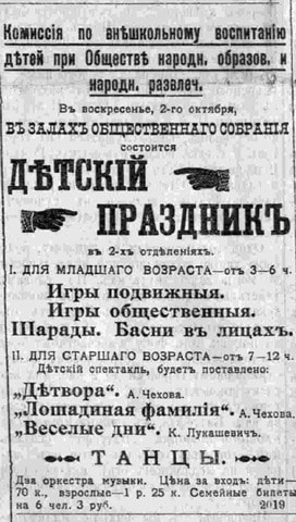 В день съезда священнослужителей у Лепендиных были именины. И по этому случаю в рыбных рядах присмотрели отличную щуку. Торговец завернул её в старый номер «Иркутских губернских ведомостей», и вечером старший из сыновей, Василий, разгладив газетный лист, прочитал: «В воскресенье, 2 октября, в залах Общественного собрания детский праздник в двух отделениях… Игры, шарады, басни в лицах… спектакль… танцы… два оркестра музыки…».