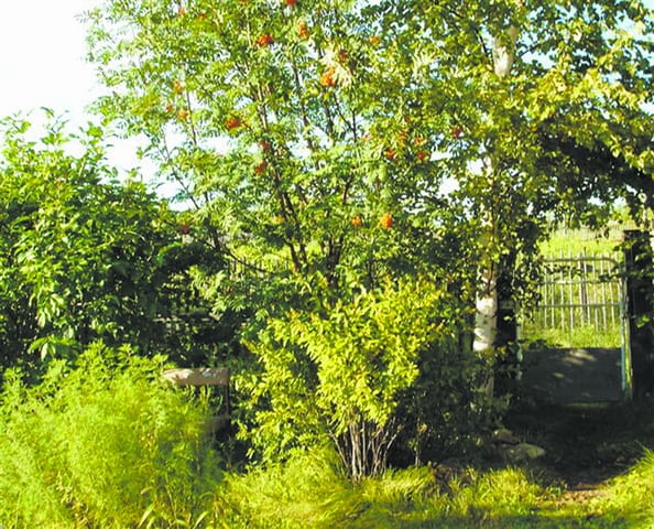 Сочетание «берёза-рябина» многим вспомнится ещё из давней пионерской песни «То берёзка, то рябина, куст ракиты над рекой. Край родной, навек любимый, где найдёшь ещё такой!». У меня эти подружки растут уже 12 лет совсем рядом, стволы на расстоянии двух метров, надо было пореже посадить, но это болезнь многих садоводов: когда садишь, то забываешь о том, как сильно разрастаются деревья за 15–20 лет. Однако деревья между собой дружат, их ветви красиво переплелись. Слева растёт куст сирени, а перед самой берёзкой, именно в том неблагоприятном двухметровом радиусе от ствола, растёт розовая спирея иволистная и тоже никакого неудовольствия не проявляет (на снимке).