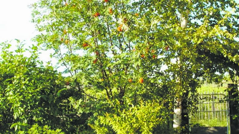 Сочетание «берёза-рябина» многим вспомнится ещё из давней пионерской песни «То берёзка, то рябина, куст ракиты над рекой. Край родной, навек любимый, где найдёшь ещё такой!». У меня эти подружки растут уже 12 лет совсем рядом, стволы на расстоянии двух метров, надо было пореже посадить, но это болезнь многих садоводов: когда садишь, то забываешь о том, как сильно разрастаются деревья за 15–20 лет. Однако деревья между собой дружат, их ветви красиво переплелись. Слева растёт куст сирени, а перед самой берёзкой, именно в том неблагоприятном двухметровом радиусе от ствола, растёт розовая спирея иволистная и тоже никакого неудовольствия не проявляет (на снимке).
