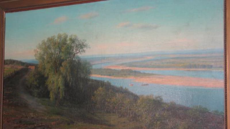 Картина из нашего собрания «Пейзаж с рекой» как нельзя лучше свидетельствует о добросовестном отношении художника к натуре. Она написана в тёплом колорите. На первом плане зелёный берег с лежащими коровами под деревом с широкой кроной, водная гладь реки с жёлтыми плёсами, широкой прозрачной лентой огибающая берег, и светлая, далёкая линия горизонта. Скрупулёзно, тщательно выписан первый план, а облачное небо и дали – светлыми, почти прозрачными лессировками.