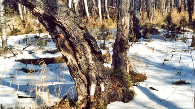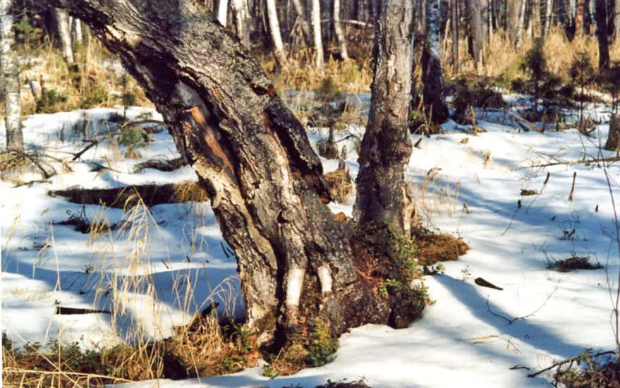 В некоторых местах, обычно на пониженном рельефе, где стоит группа берёз, морозобойные трещины видны почти на каждом стволе. Такую картину я видел однажды в Баргузинском заповеднике в низовье реки Таркулика. Деревья очень почтенного возраста, поперечником до полуметра, стояли близко друг от друга, и каждое было помечено морозобойной трещиной. По их виду можно догадаться, что печать эту деревья получили в одну-две особо морозные зимы. Примечательно, что вдоль трещин на каждом дереве поселились и разрослись берёзовые грибы – чага. Один из них вырос на самом толстом стволе и был более десяти килограммов. Таких огромных грибов-чаг никогда более я не видел.