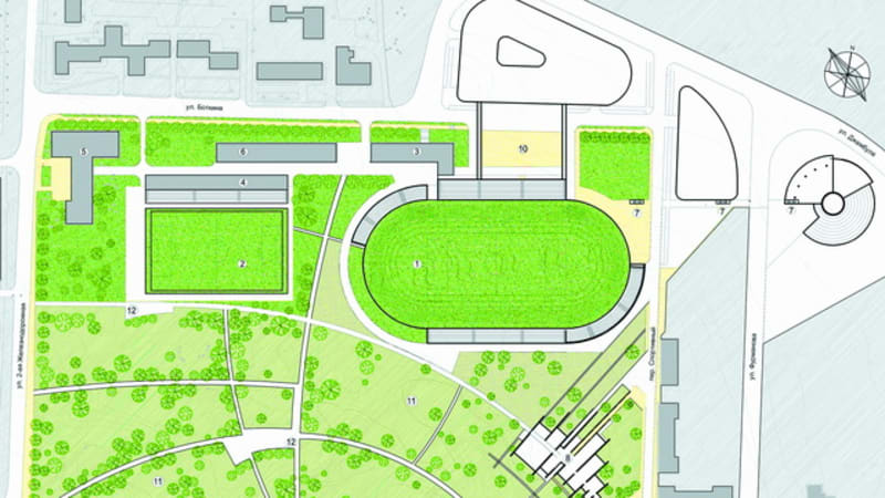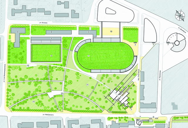 1. Стадион «Локомотив» с крытыми трибунами. 2. Тренировочное футбольное поле. 3. Реконструируемый гостиничный комплекс. 4. Блок вспомогательных помещений. 5. Существующий спорткомплекс. 6. Блок административных помещений. 7. Подземный переход (2). 8. Музейный комплекс «Глазковский некрополь». 9. Остановка общественного транспорта. 10. Аванплощадь стадиона. 11. Зелёная зона парка. 12. Площадки парка. (план предоставлен ОАО «Иркутскгражданпроект»)