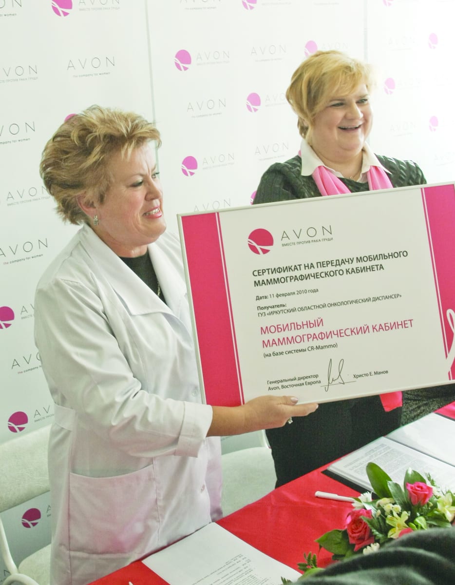 11 февраля представители благотворительной программы AVON «Вместе против рака груди» торжественно передали свой приз – мобильный маммографический кабинет – Иркутскому областному онкодиспансеру. Принимая сертификат на уникальное диагностическое оборудование, министр здравоохранения Иркутской области Гайдар Гайдаров отметил, что его оптимальное использование «будет способствовать не только раннему выявлению опасного недуга, но и повысит уровень осведомлённости женщин о своём здоровье».