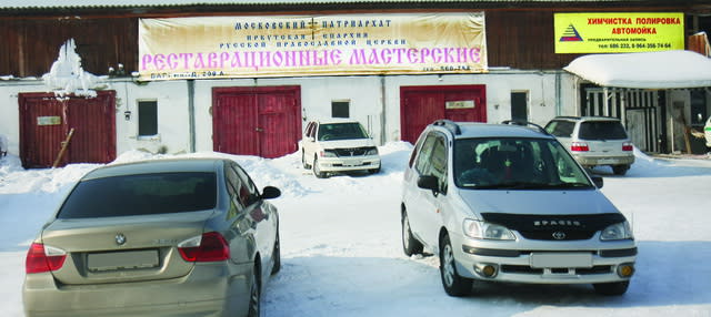 Огромная вывеска: «Реставрационные мастерские. Московский Патриархат. Иркутская епархия Русской Православной Церкви». И рядом помельче: «Химчистка. Полировка. Автомойка». Это привычный пейзаж базы по Баррикад, 209а. «Здесь иконы реставрируют, иконостасы, тут мастерские, конкретные мастерские», – сказал нам по телефону управляющий базой Сократ Кулик. Он тоже не возражал против нашего визита. «Часть площади, конечно, отдана под автомагазин, потому что у церкви нет денег содержать эти базы, – сказал он сразу. – Их с этой целью и передали. Владыка обращался ещё к губернатору Тишанину с просьбой, чтобы город как-то помог. И губернатор передал эти базы. Вот вам базы в безвозмездное пользование, пользуйтесь и из них исчерпывайте дивиденды».