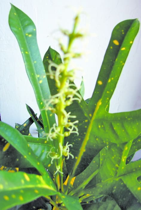 В комнатных условиях кротон цветёт редко, а у меня зацвёл. Его цветок – это метёлка из белых пушистых шариков.