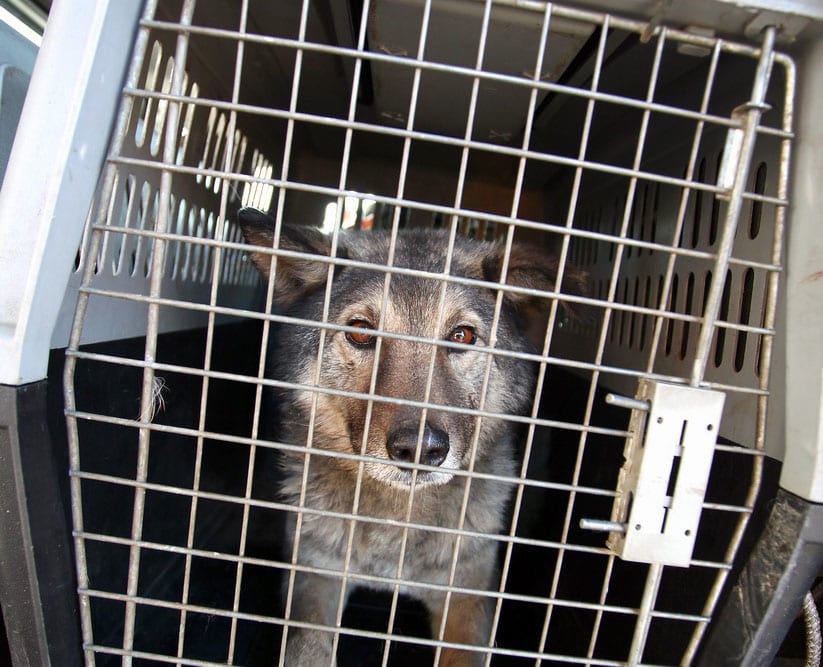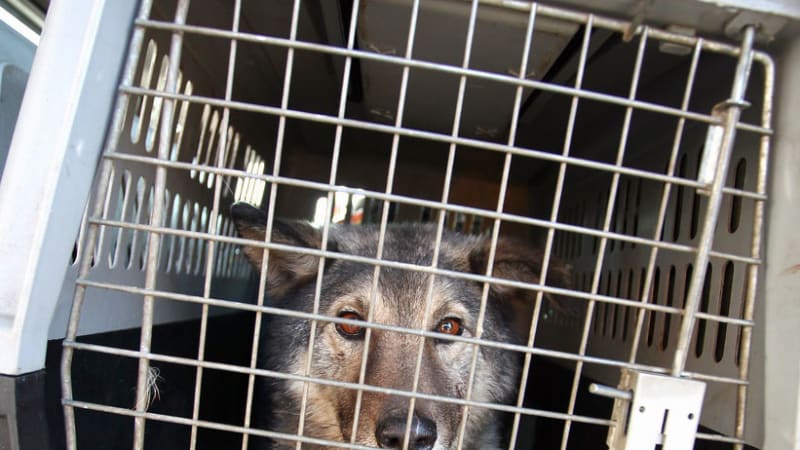 В «переноске» – пластиковом боксе – пойманного двортерьера грузят в