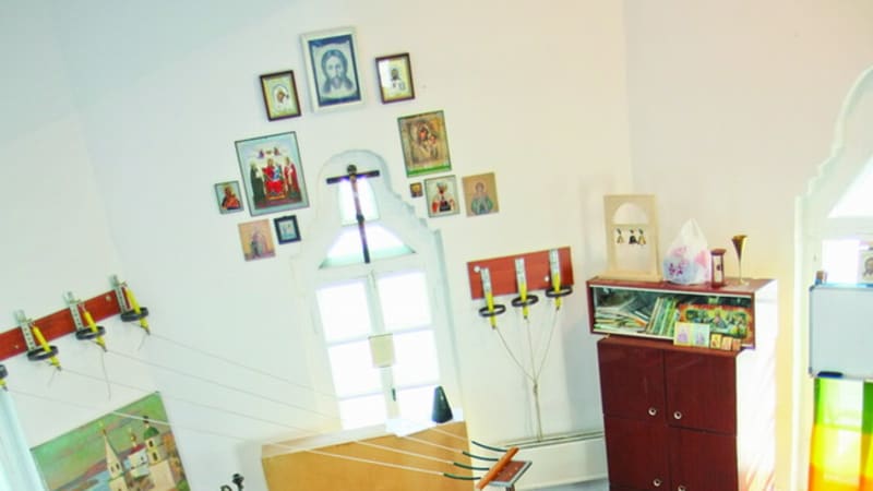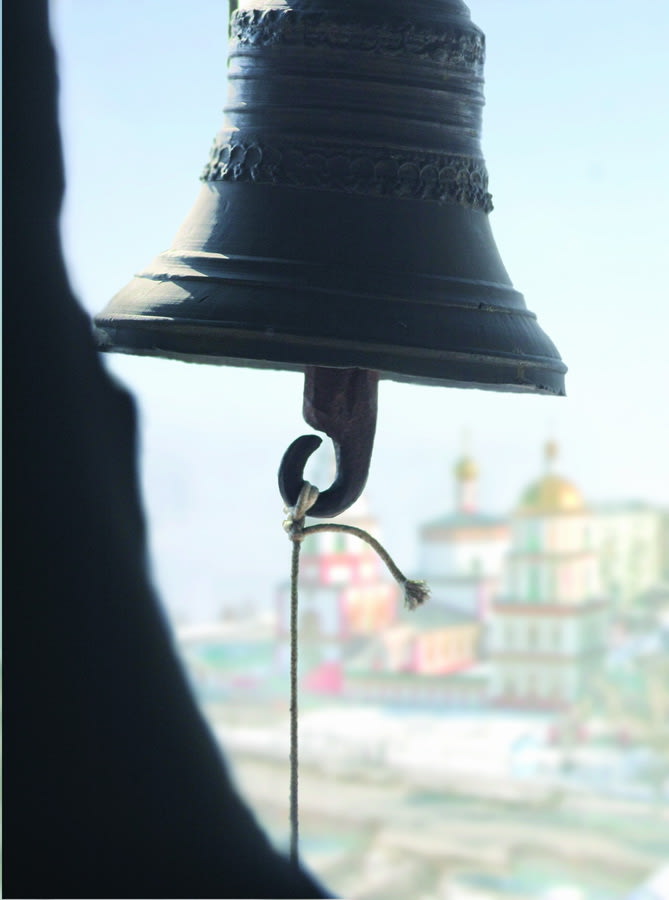 На колокольню Спасской церкви мы поднимались по узенькой винтовой лестнице. Почему-то во всех храмах на колокольни ведут именно такие лестницы – очень узкие и очень крутые, тёмные, с низкими сводами. Пробираешься по этой лестнице, словно прорываешься сквозь толщу времён. Вот наконец блеснуло солнце. И словно в награду за преодоленный подъём, с колокольни открывается фантастический вид. Как на ладони лежит город, залитый солнцем, опоясанный синей Ангарой. Но мы пришли сюда не видом любоваться, а на урок колокольного звона. Местный звонарь, он же руководитель и преподаватель в школе колокольного звона при храме Спаса Нерукотворного Образа в Иркутске, Александр Ипполитов сегодня даёт мастер-класс.