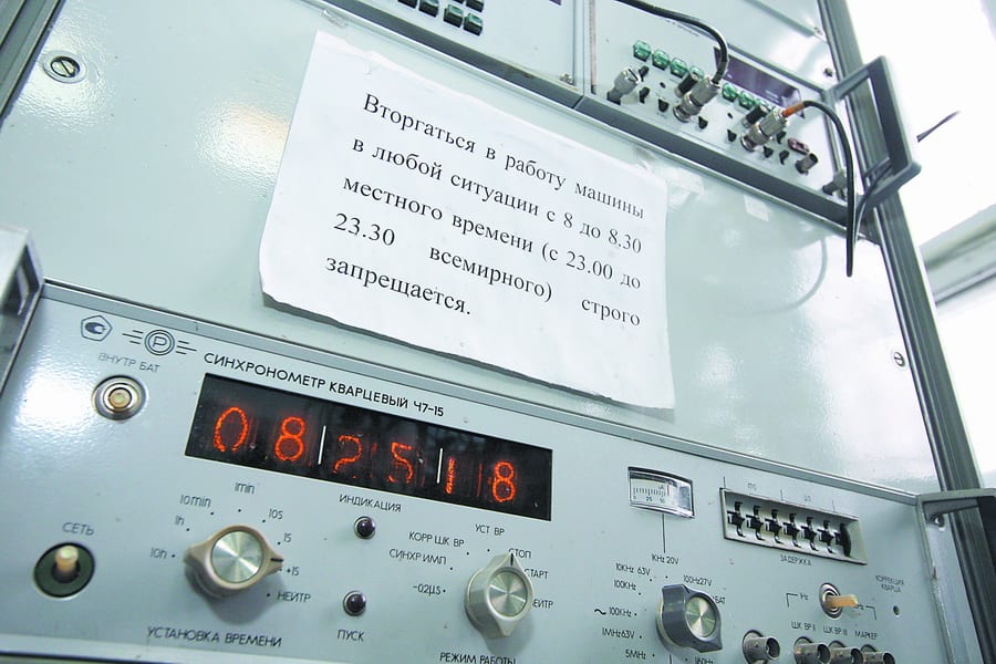 Рассказы о том, что под институтом «пятиэтажный дом под землёй», оказались мифом. Атомные часы размещены в цоколе здания, в двух смежных комнатах. В них довольно прохладно, стоит столик дежурного. «Вот они, атомные часы», – Виктор Егоров показывает на несколько «шкафов» с узенькими экранами, на которых светятся цифры. Все приборы – ещё 70-х годов производства. В ответ на моё недоумение начальник отдела времени и частоты, учёный хранитель эталона Владислав Акулов ухмыльнулся: «А что вас удивляет? Система «Тополь» – изобретение примерно тех же лет, и ничего, страх наводит». А Виктор Егоров ласково прикасается к одному из «шкафов».
