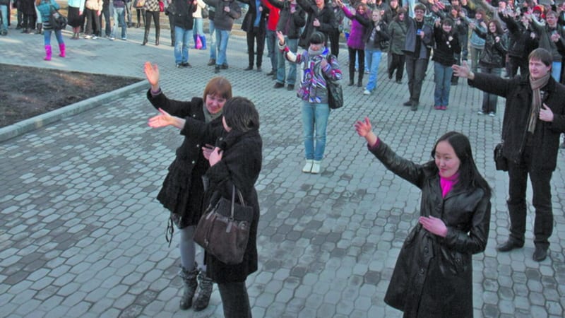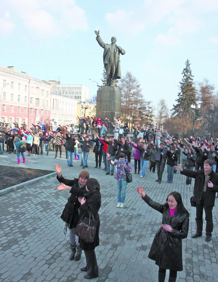 Заставить жить памятники реальной жизнью попыталась 19 апреля обычная молодёжь Иркутска, не связанная с профессиональным сообществом архитекторов, историков и проектировщиков. В этот день около семи вечера толпа иркутян собралась возле памятника Владимиру Ильичу Ленину. Дождавшись, когда электронные часы, висящие на Байкальском государственном университете экономики и права, покажут 18:55, люди стали поднимать правые руки вверх и становиться в ту же самую позу, в которой изображён вождь Октябрьской революции. Это не был стихийный митинг. Это был организованный флэш-моб, посвящённый прошедшему накануне Международному дню памятников.
