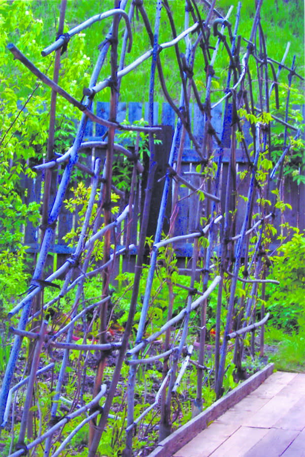 В качестве опор для вьющихся растений я с успехом использую ивовые ветви, сплетённые в виде трельяжной стенки. Следует отметить, что «лазающие» растения охотнее взбираются по естественно округлым формам веток и крепче на них закрепляются, нежели по другим приспособлениям, будь то строганые бруски, сетка-рабица или специальная синтетическая сетка. Особенно хорошо подходят ивовые каркасные устройства для таких древесных лиан, как лимонник, паслён сладко-горький, виноград девичий и другие.
