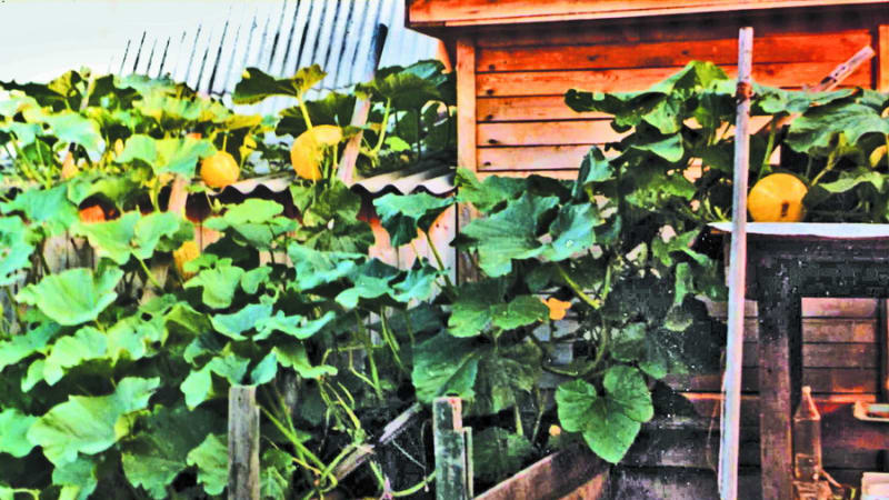На другом конце участка выращиваю  в старых железных бочках другой длинноплетистый сорт тыквы. Старую дырявую бочку всё лето заполняем травой, через 2–3 года получается отличный компост. Весной добавляю сюда несколько вёдер перегноя, перемешиваю с золой, можно удобрить суперфосфатом. В середине мая сею семена тыквы на глубину 4 см, закрываю посадки бумагой, сверху плёнкой. После появления всходов плёнку поднимаю и укладываю на верх бочки, закрепляю её верёвкой, получается мини-парник. Днём плёнку открываю, убираю совсем.