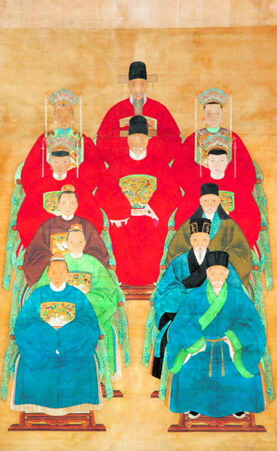Уже точно можно говорить о том, что на всех трёх свитках представлены гражданские чиновники и их жёны в парадной одежде. Причём в Китае особая роль придавалась цветовой символике костюма. Чиновники определённого ранга (а их всего было девять) могли носить одежду только «своего» цвета. Например, на одном из наших портретов все изображённые предки одеты в халаты красного цвета, что говорит об их высоком ранге.
