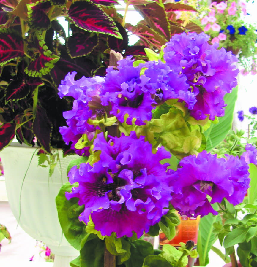Есть сорта с цветами гвоздики  или  розы, есть сорта с огромными махровыми бахромчатыми цветами. Лучше всего черенкуются и наиболее выразительны в подвесных кашпо ампельные петунии. Каскад цветов у них достигает одного метра.