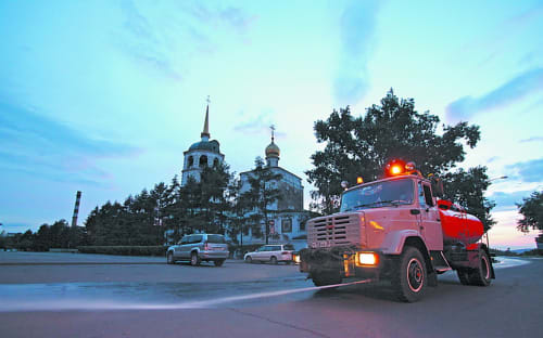 Когда «Скандия» завершила свою работу, Алексей Струев предложил показать ещё и поливомоечную машину. На высказывание о том, что грузовики с голубыми кабинами и ярко-оранжевыми цистернами, при виде которых пешеходы отпрыгивали как можно дальше от края тротуара, чтобы не попасть под струю, ушли в небытие вместе с автоматами с газированной водой, квасом из бочки в стеклянных кружках и пломбиром по 19 копеек, он отвечает: «Мы же в основном работаем ночью и рано утром, когда нет движения, так что сейчас их днём на улицах не увидишь». И действительно, в этот момент из-за угла появляется «ЗиЛ» (правда, его кабина окрашена в нейтральный серый цвет). И, как забытая картинка из детства, дорогу перед ним перебегает пешеход, который пытается увернуться от струи холодной воды, бьющей из распылительного сопла машины. «В цистерну входит 6 кубометров воды, этого хватает примерно километра на два, – рассказывает Алексей Струев, который работал водителем этой самой поливомоечной машины до того, как стал начальником смены. – За ночь при таком режиме работы она проходит 20–25 улиц». А те улицы, мимо которых они прошли ночью, днём чистит другая техника «Иркутскавтодора». Семь дней в неделю. Если, конечно, погода позволяет.